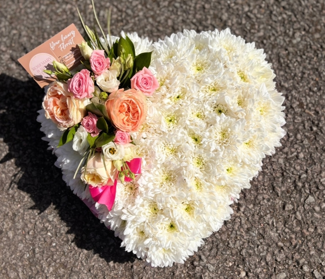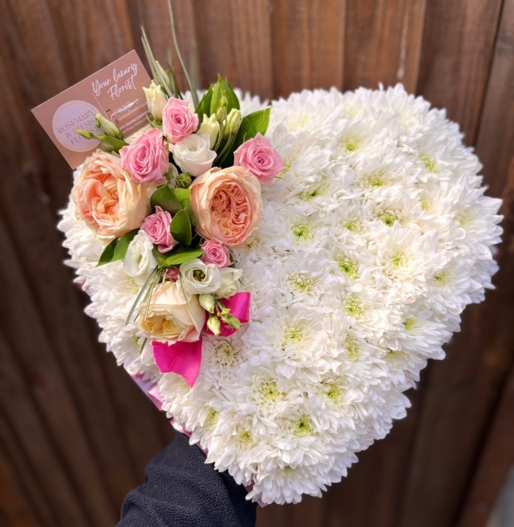 This pretty yet subtle massed heart arrangement is a truly fitting piece for a time of sadness and loss. Beautifully presented on a massed white Chrysanthemum base, the beautiful bespoke coloured spray brings a special feature to the tribute creation, exquisitely finishing off the piece.