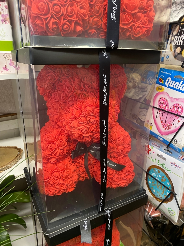 A stunning large red bear made with foam roses designed to last forever;finished in one of our luxury clear gift boxes and ribbon.