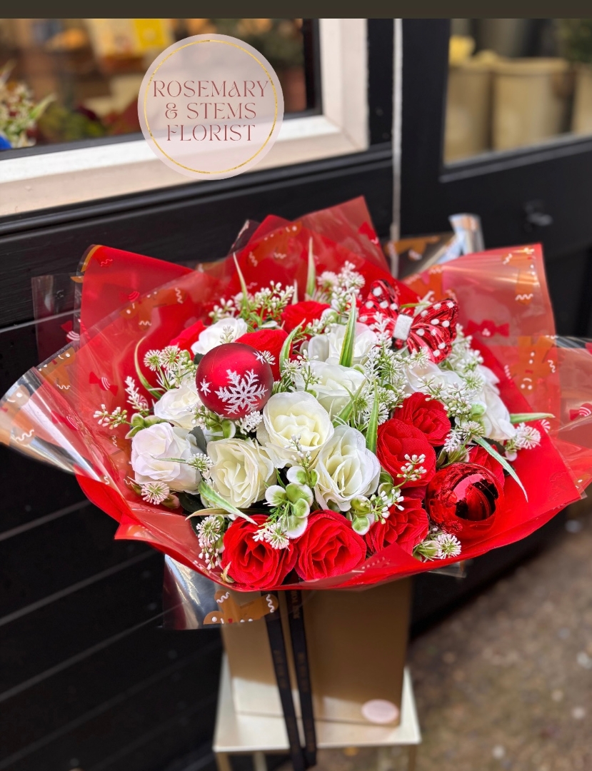 A beautiful bouquet from our silk collection. 24 beautiful cream and red silk roses expertly arranged and finished with some sparkle, the perfect bouquet to last forever with absolutely no maintenance required.