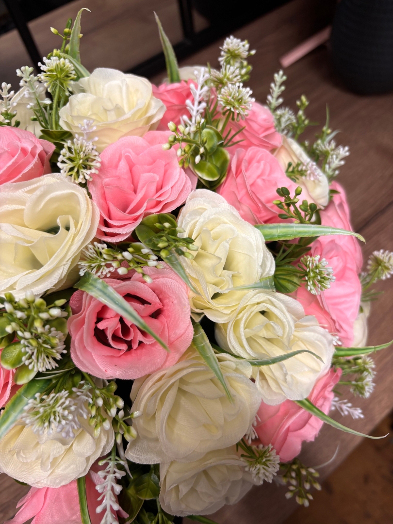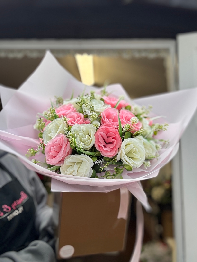 A beautiful collection 24 of our finest silk roses in pink and white, gift wrapped and complete in gift box. A gift that truly will last forever!