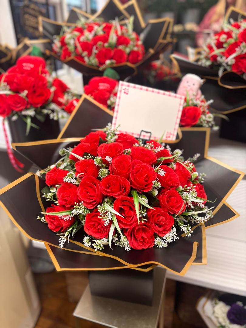 A beautiful collection of 24 of our finest silk roses in red, gift wrapped and complete in gift box. A gift that truly will last forever!